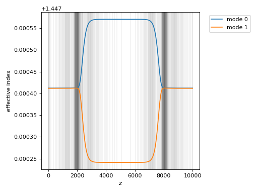 The two eigenmodes are essentially degenerate at the beginning and end of the waveguide; in the middle, the degeneracy splits. (Aside: if the boundaries of single-mode cores were less resolved, we might actually see the modes cross in eigenvalue, which complicates the characterization).