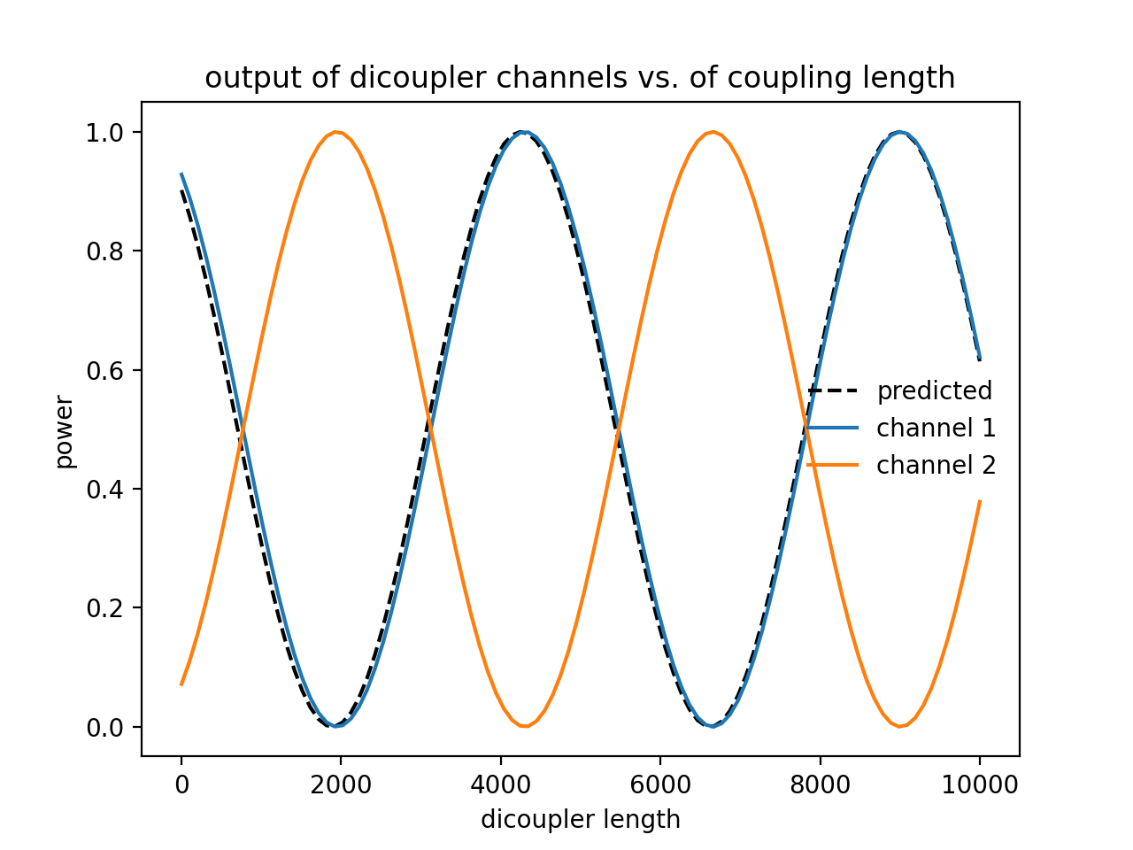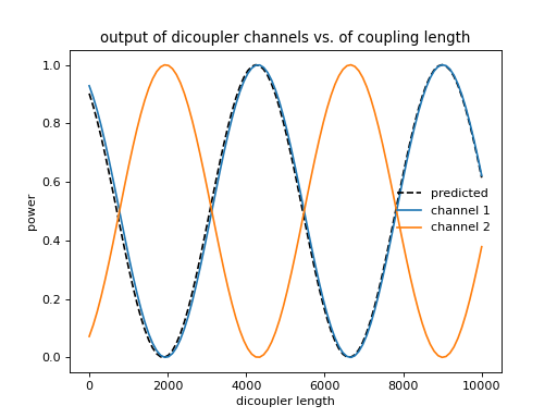In the above plot, I also show a “predicted” power output as a function of length. The derivation can be found in fiber optics textbooks. For an ideal, symmetric dicoupler with light injected solely into channel 1, the output power in channel 1 is