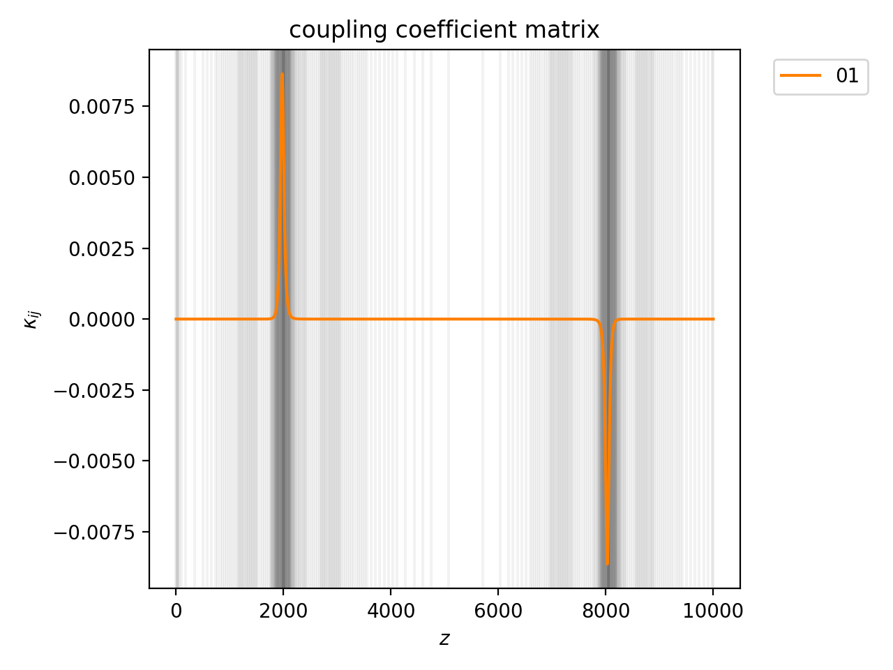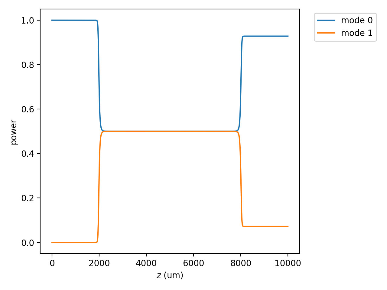 Let’s launch light into one end and look at how the mode powers change with \(z\).