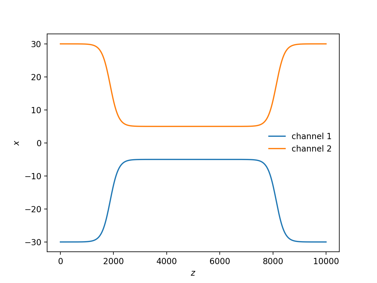 In the coupling region, you’ll see the field oscillate between the two channels with \(z\).
