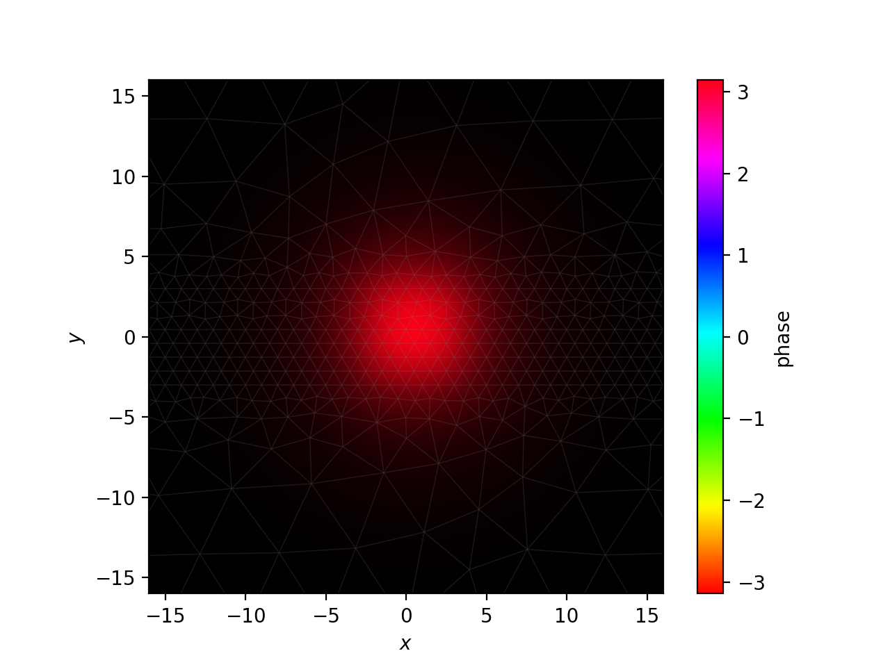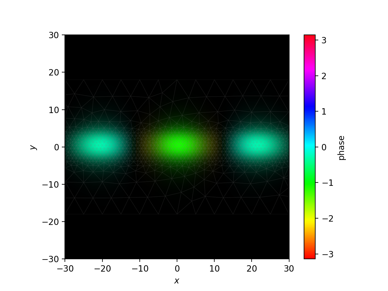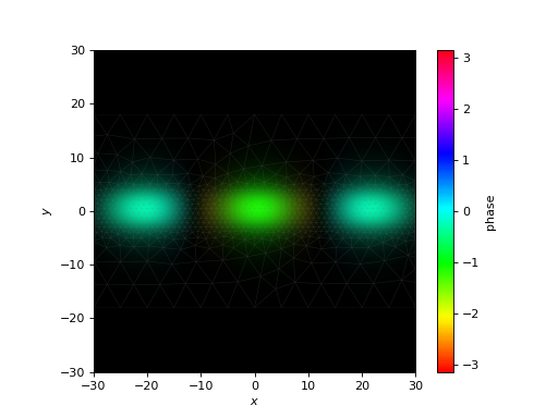 One nuance in this example is that we don’t need to formally propagate, since all the coupling coefficients are 0. The power in each mode is preserved; the only thing we need to do is apply the phase evolution for each mode. This means we can directly get the propagated fields with Propagator.make_field(). I will plot the field at the expected \(z\) coordinate for a three-fold self image.