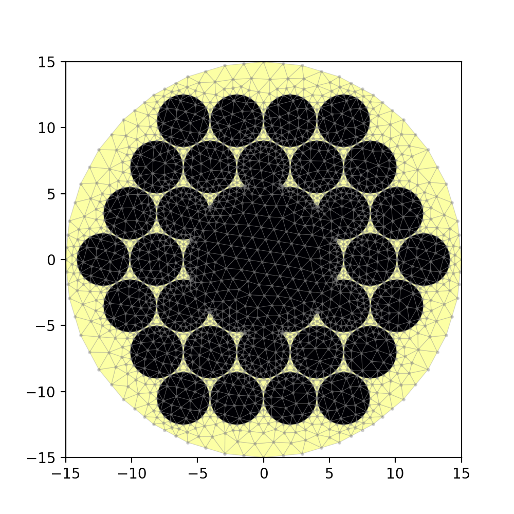 hollow_PCF = PhotonicBandgapFiber(void_radius,hole_radius,clad_radius,nclad,hole_separation,hole_res,clad_res,hole_mesh_size=1.0,clad_mesh_size=2.0)