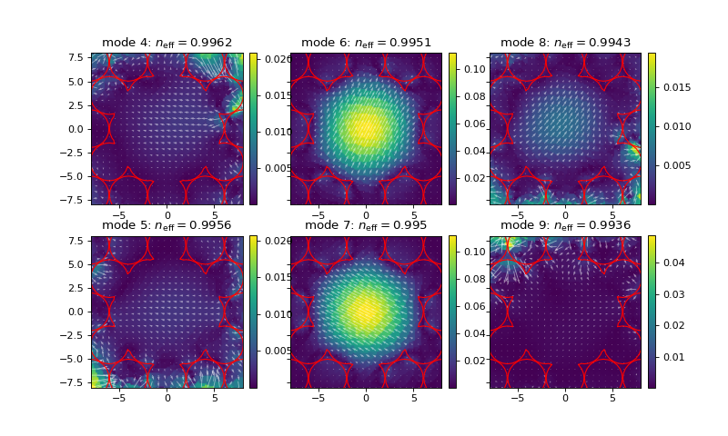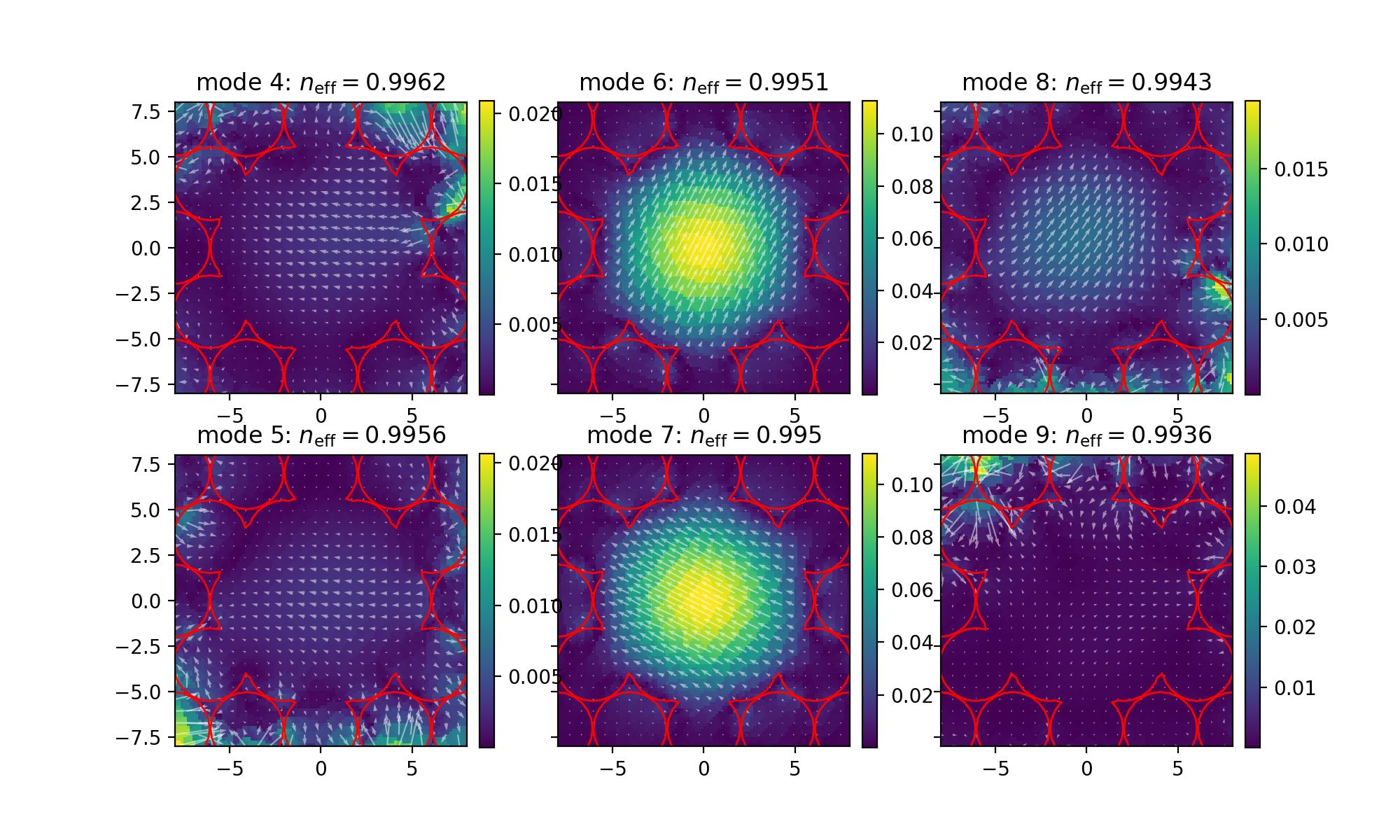 Next, let’s solve. The voids in this fiber have index 1, so I will search for modes with the largest indices at and below 1, using the optional target_neff argument in solve_waveguide_vec().